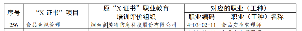 烟台富美特信息科技股份有限公司(食品伙伴网)作为原教育部1+X证书评价组织,所申报的食品合规管理职业技能等级证书将对应的职业工种为食品安全管理师。